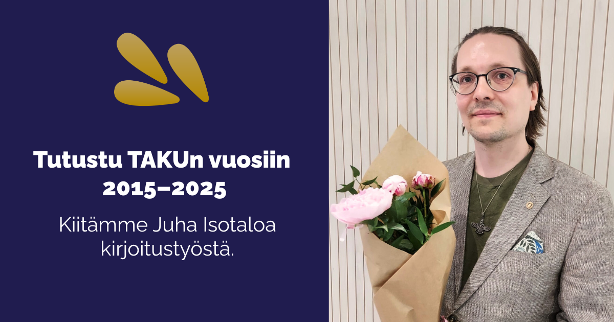 –Tämä kirjoitustyö on ollut minulle hyvin henkilökohtainen projekti. Tutkiessani TAKUn toimintaa viimeisen kymmenen vuoden ajalta tutkin samalla omaa kaksikymmenvuotista taivaltani takulaisissa luottamustehtävissä. Tätä kirjaa varten koen haastatelleeni haastateltujen lisäksi itseäni.