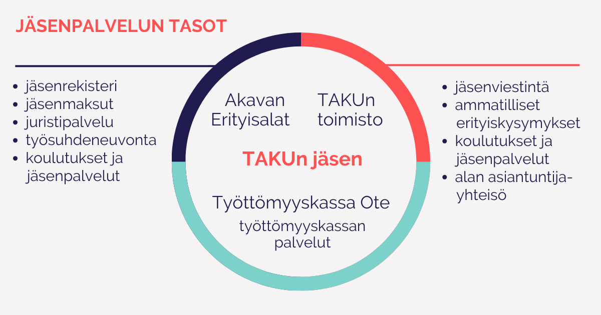 TAKUn jäsenille palveluita tuottavat oman ammattijärjestön lisäksi kattojärjestömme Akavan Erityisalat sekä Työttömyyskassa Ote.
